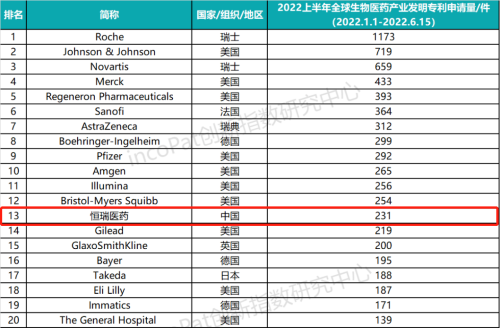 近日,全球专利数据库incoPat创新指数研究中心发布全球生物医药发明专利TOP100榜单,918博天堂医药以上半年231件发明专利申请量位列榜单第13名,是唯一一家进入TOP20的中国药企。