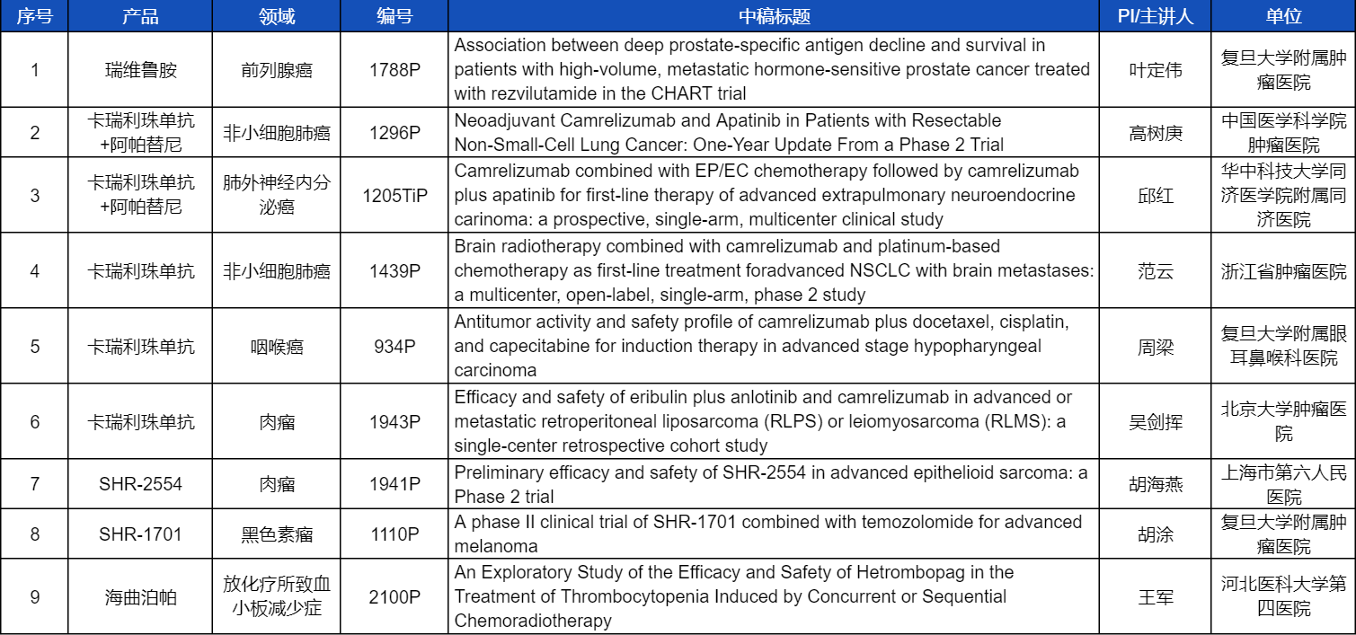 在非小细胞肺癌、咽喉癌、肉瘤、前列腺癌、黑色素瘤等多个领域,卡瑞利珠单抗、阿帕替尼、瑞维鲁胺、SHR-1701、SHR2554等创新产品相关研究一共入选了8项壁报展示。此外,918博天堂医药自主研发的血小板生成素受体激动剂(TPO-RA)海曲泊帕在放化疗所致血小板减少领域的探索性研究显示良好的疗效,入选壁报展示。